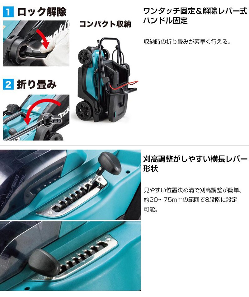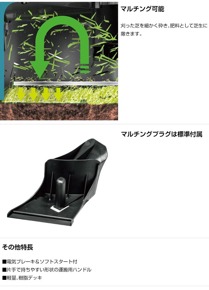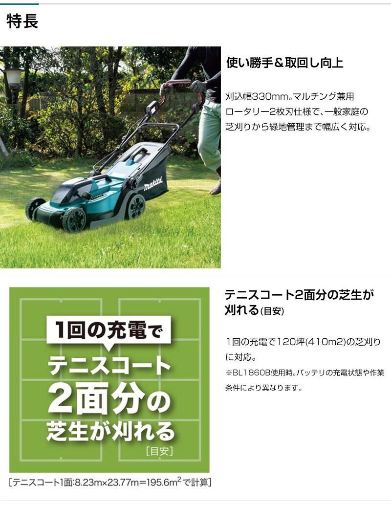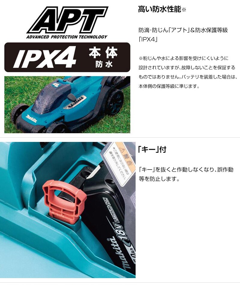 【18Vリチウムイオンバッテリー パワフル コンパクト 一般家庭 芝刈り 緑地管理 ロータリー2枚刃 マルチング兼用 レバー式 刈高調整 8段階 本体防水保護 IPX4 誤作動等防止 高剛性ハンドル マルチング可 軽量 樹脂デッキ 充電式 コードレス 工具 電動工具 DIY ツール 工具 用品 makita 純正品】