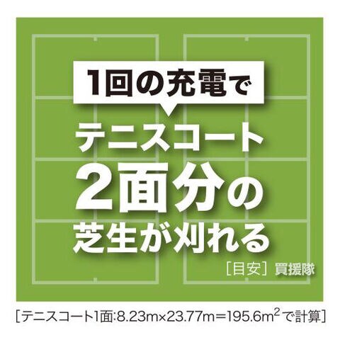 【テニスコート2面分の芝生が刈れる(目安)】1回の充電で120坪(410m2)の芝刈りに対応。