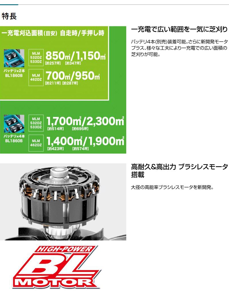 【一充電で広い範囲を一気に芝刈り】バッテリ4本(別売)装着可能。さらに新開発モータプラス、様々な工夫により一充電での広い面積の芝刈りが可能。