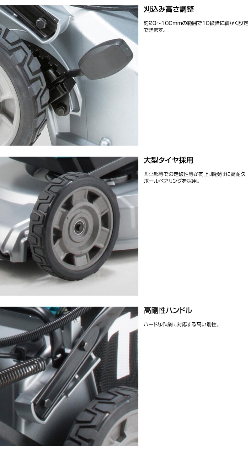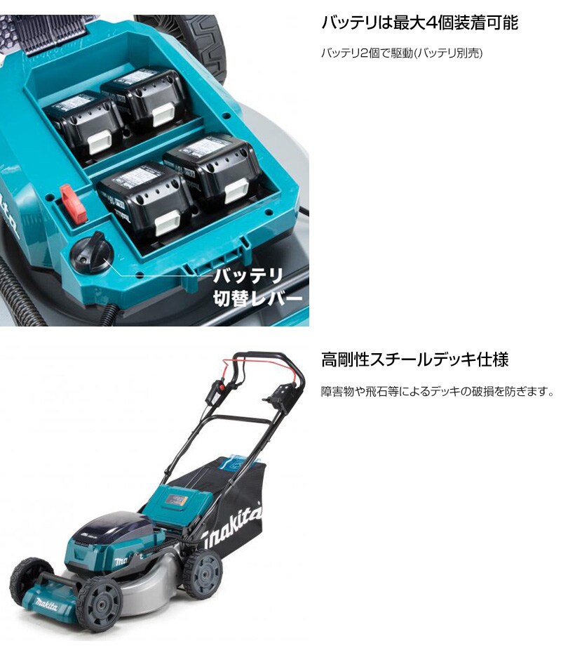 【自走式 スチールデッキ 高剛性 本格仕様 高耐久 高出力 静音 ハイパワー 高能率 刃物前方傾斜 2度切り防止 独立モータ駆動 無段変速可能 速度調整 マルチング可 10段階 本体防水保護 IPX4 充電式 コードレス 工具 電動工具 DIY ツール 工具 用品 makita 純正品】