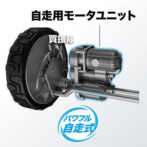 【自走用独立モータユニット搭載】独立モータ駆動だから「作業時」は刃物回転数に関係なく走行スピードを選べムラなくキレイな仕上り。「移動時」刃物を回転させずに安心で静かな自走移動が可能。