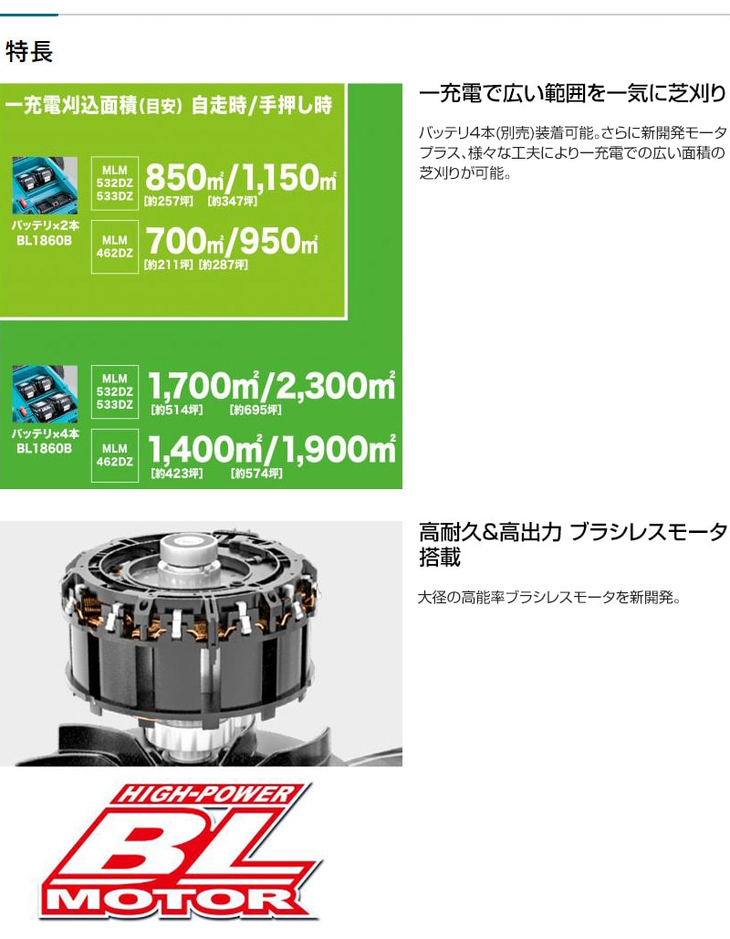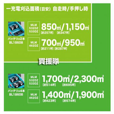 連続作業時間※1 (自走時/約40分、手押時/約50分)別売りBL1860Bx4本