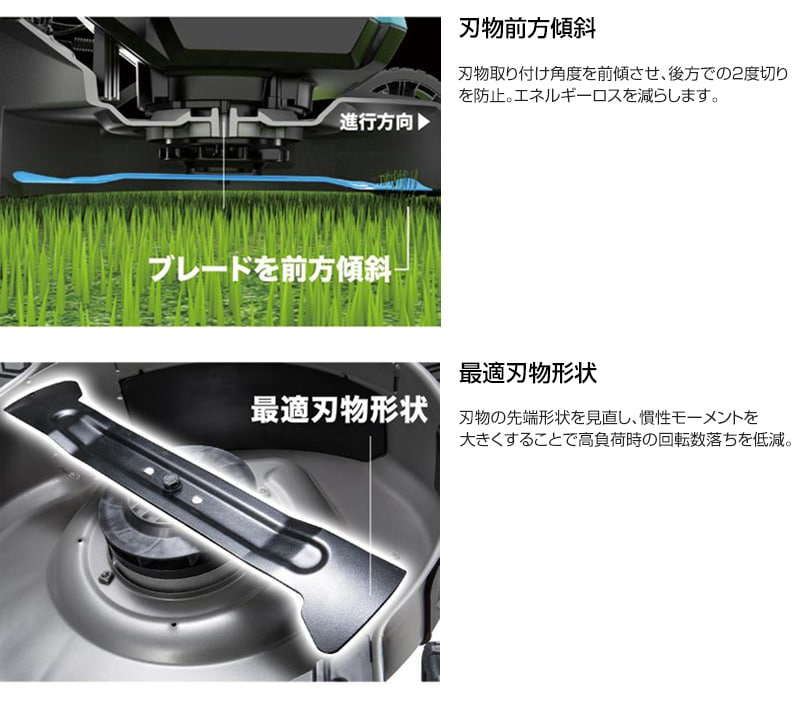 【刃物前方傾斜】刃物取り付け角度を前傾させ、後方での2度切りを防止。エネルギーロスを減らします。
