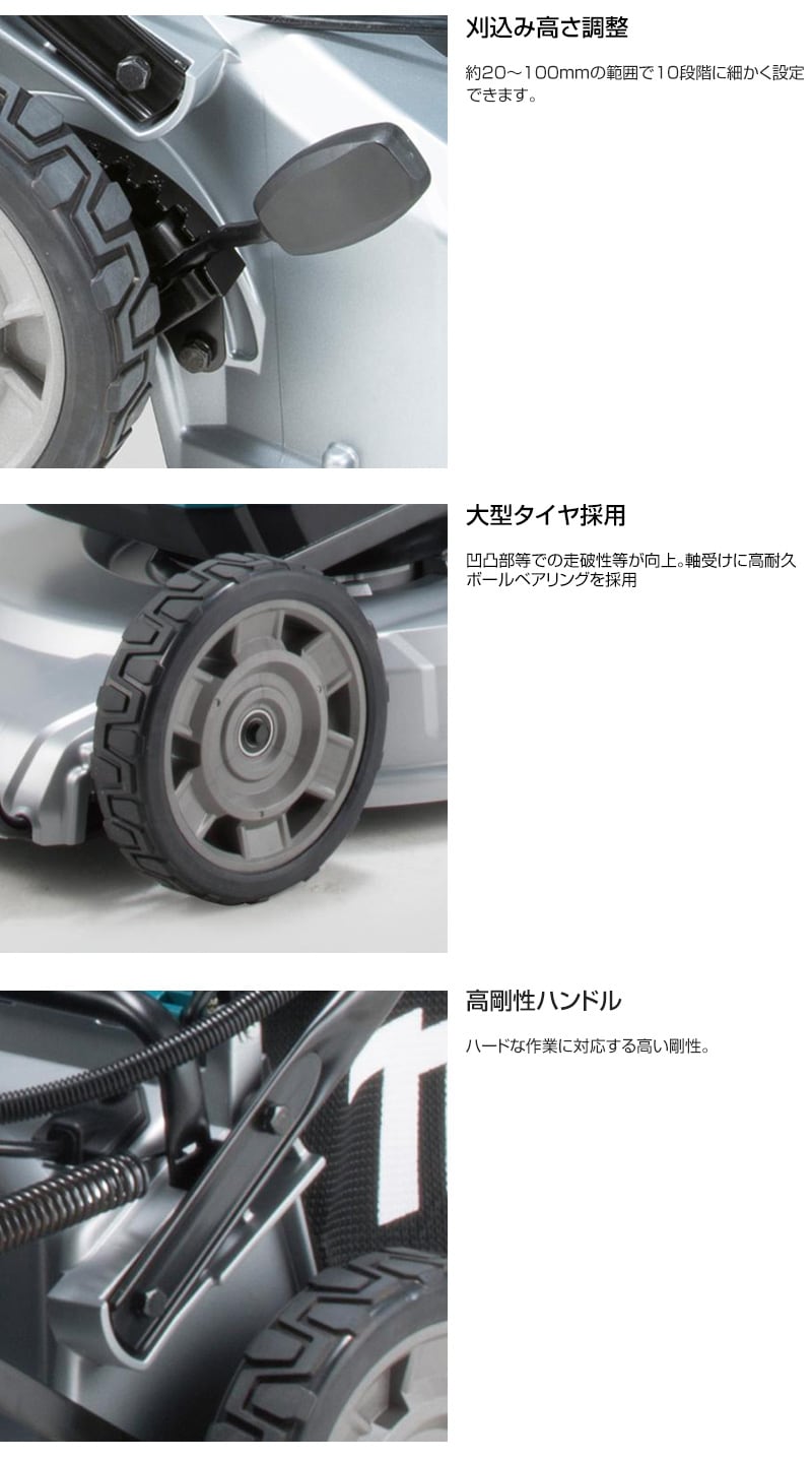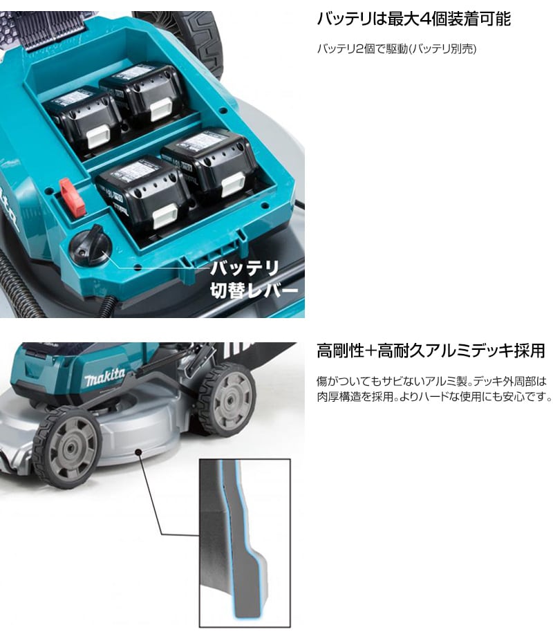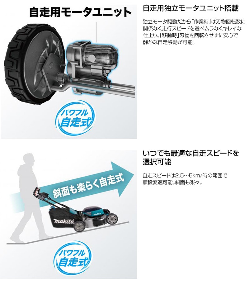 【自走式 高剛性 高耐久 アルミデッキ 本格仕様 ブラシレスモータ搭載 刃物前方傾斜 2度切り防止 最適刃物形状 自走移動 無段変速可 マルチング可 10段階 充電式 コードレス 工具 電動工具 DIY ツール 工具 用品 makita 純正品】