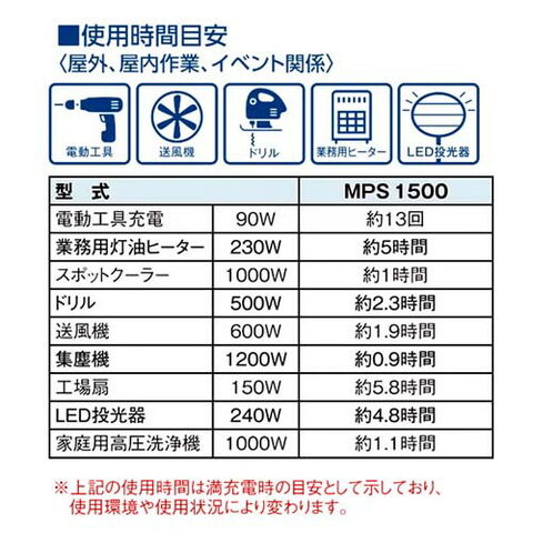 使用時間目安(屋外、屋内作業、イベント関係)