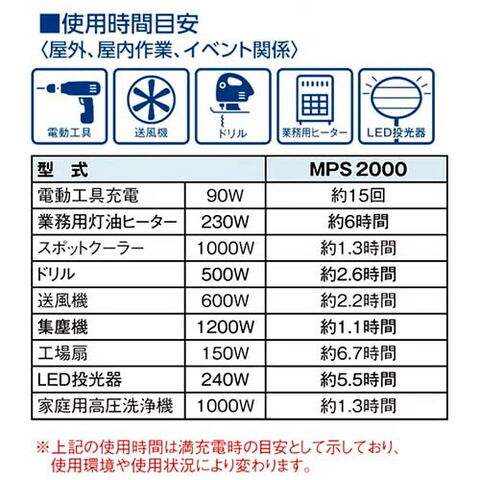 ※コンプレッサー、モータ等は起動時に大きな電力を必要とします。使用する機器の消費電力が本機の出力範囲であっても使用できない場合があります。