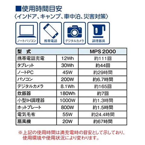 使用時間目安(インドア、キャンプ、車中泊、災害対策)