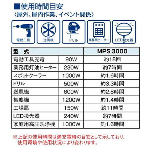 ※コンプレッサー、モータ等は起動時に大きな電力を必要とします。使用する機器の消費電力が本機の出力範囲であっても使用できない場合があります。