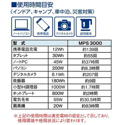 使用時間目安(インドア、キャンプ、車中泊、災害対策)