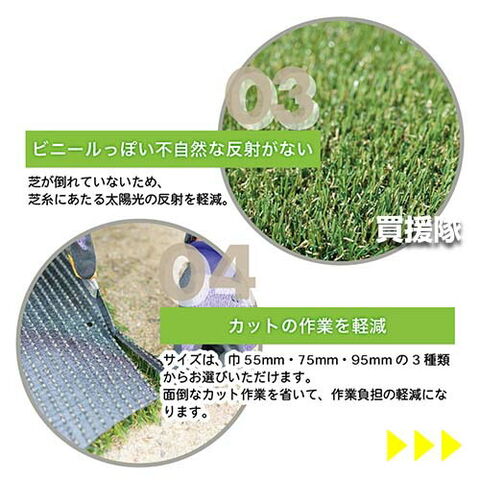 サイズは、巾55mm(別売)・75 mm・95 mm(別売)の3種類。目地の巾に合わせて選ぶことができ、人工芝をカットする作業が削減でき、作業効率が向上。
