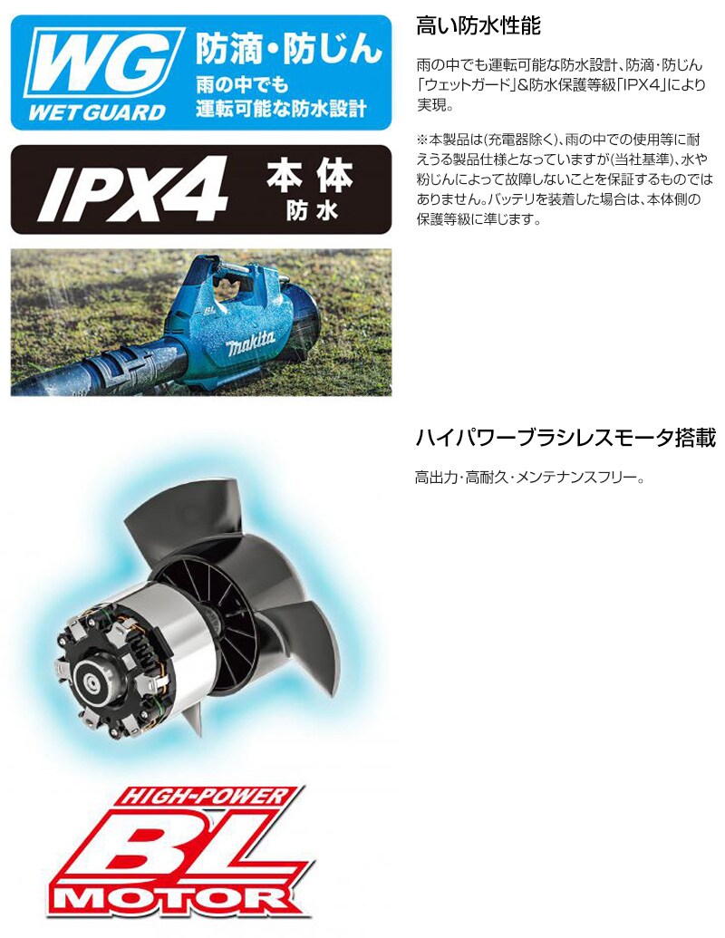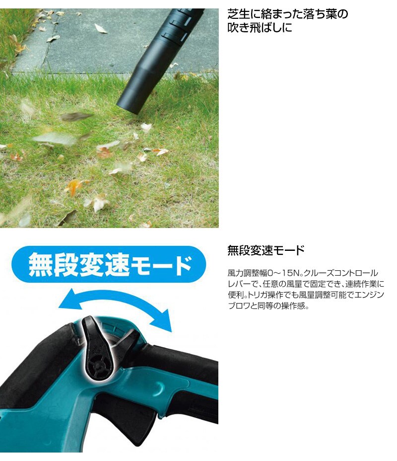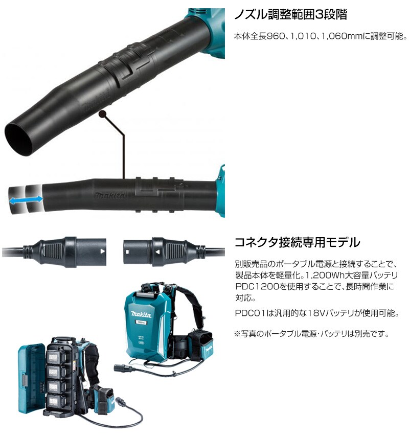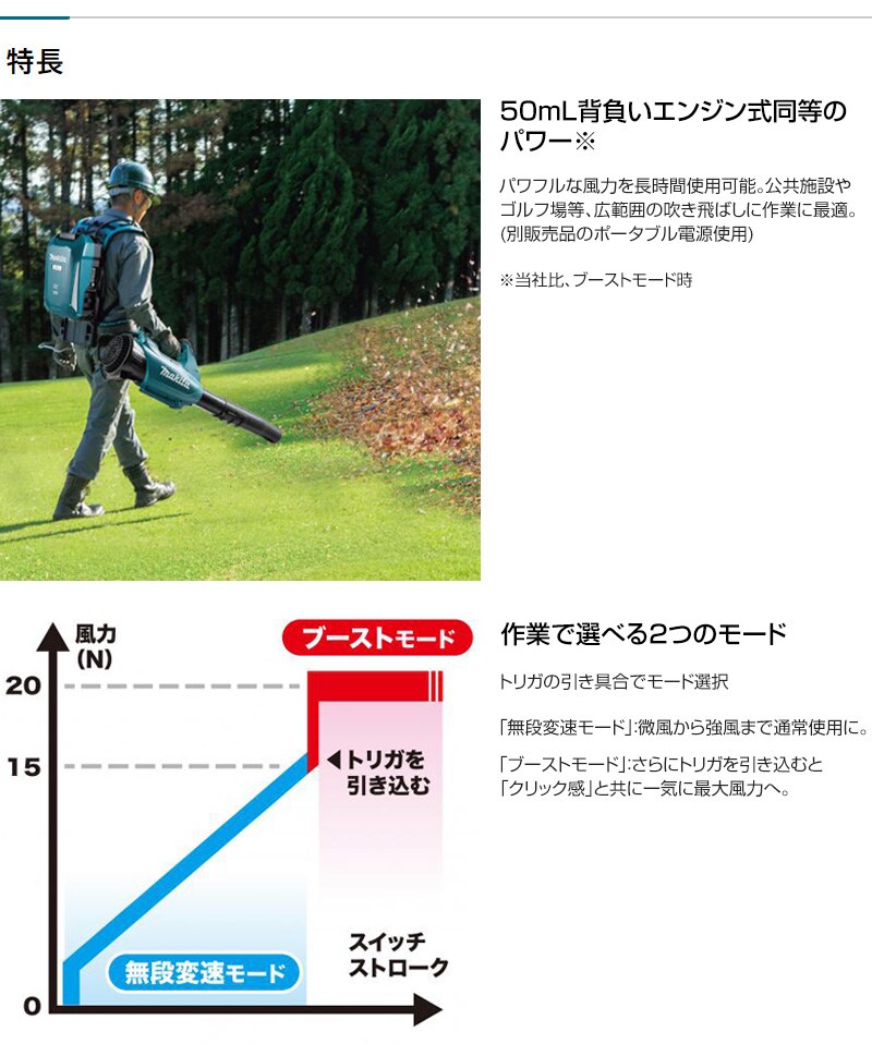 【コネクタ接続専用 広範囲 パワフル 長時間 吹き飛ばし 公共施設 ゴルフ場 グラウンド 落ち葉 露飛ばし 建物周り 駐車場 2モード 無段変速 ブースト 連続作業 パワフル 疲労軽減 本体防水保護 IPX4 高出力 高耐久 メンテナンスフリー ノズル調整 3段階 低騒音 ショルダーベルト取付可 工具 電動工具 DIY ツール 工具 用品 makita 純正品】