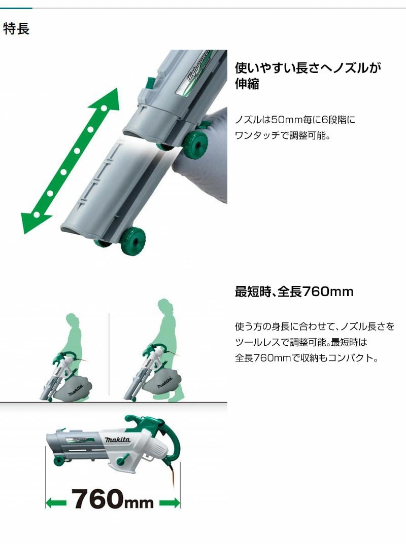 【最短時、全長760mm】使う方の身長に合わせて、ノズル長さをツールレスで調整可能。最短時は全長760mmで収納もコンパクト。