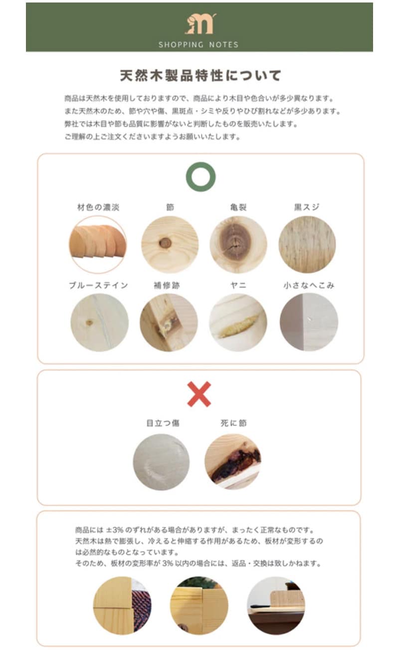 ※天然木を使用した商品につき木目や色味、節など個体差があります。これら天然木の特性を理由とした返品・交換はお受けできませんので予めご了承ください。
