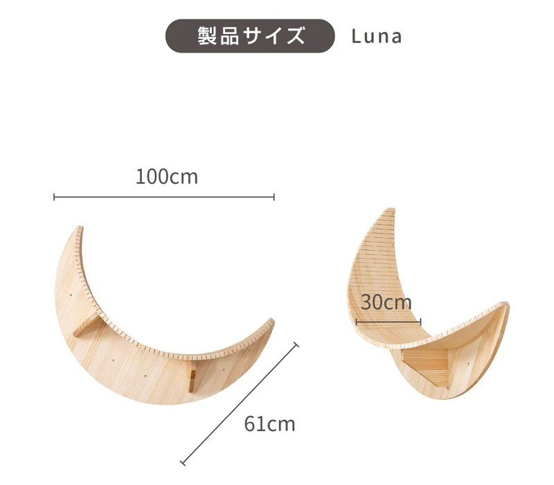 見た目もキュートで、猫のいない家庭でも思わず欲しくなってしまう一品。縦61×横100×奥行き30cmの大きなステップながら、シンプルなつくりとナチュラルウッドのぬくもりで、お部屋の圧迫感を感じることはありません。愛猫を三日月にのせて、月の猫ちゃんにしてみませんか。