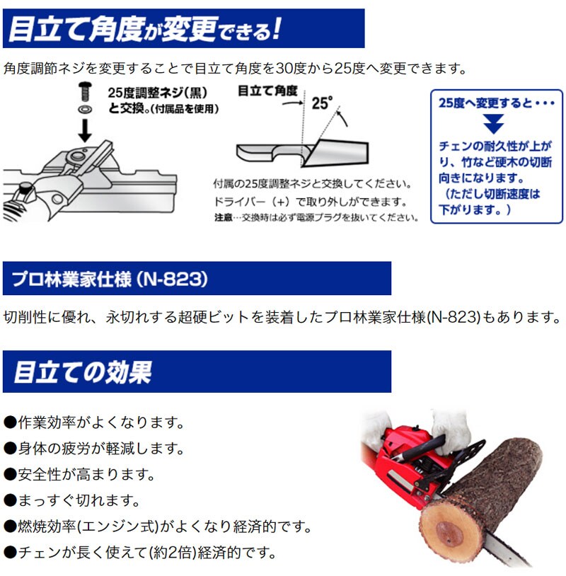 またプロ仕様の目立て角度可変式などさまざまなニーズを満たす適品構成となっています。