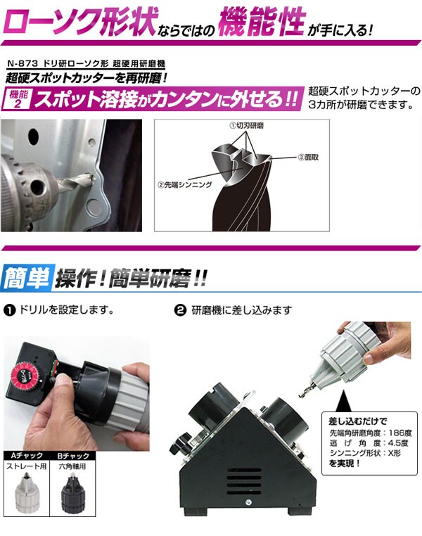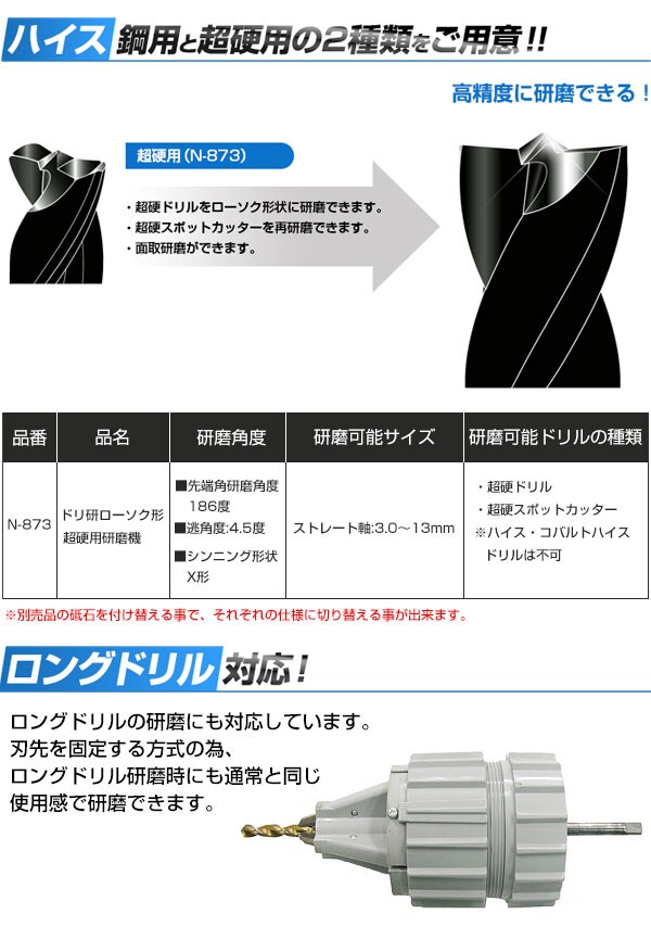 ※研磨可能ドリル種類:ハイス・コバルトハイスドリルは研磨できません。