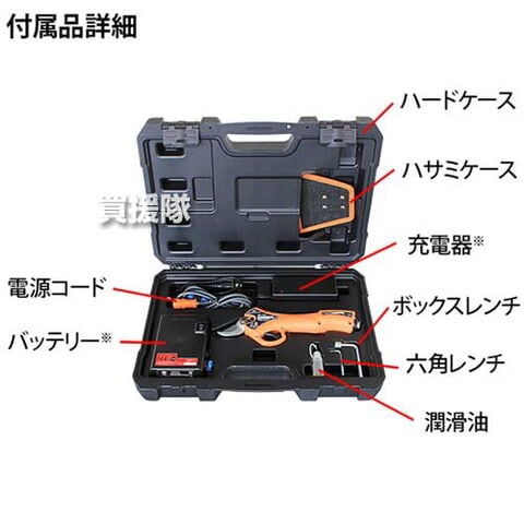 付属品 バッテリー・充電器、電源コード、潤滑油、ボックスレンチ、六角レンチ、ハサミケース、ハードケース