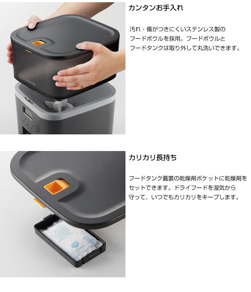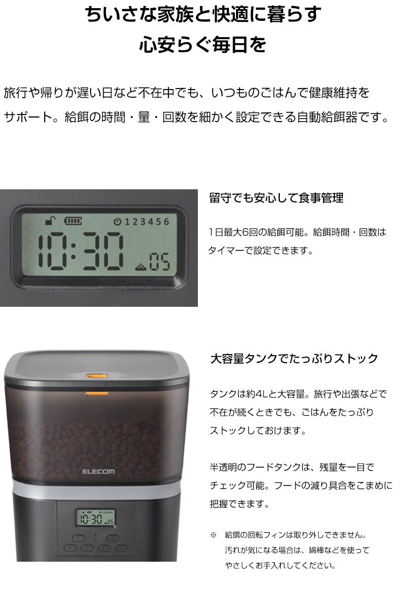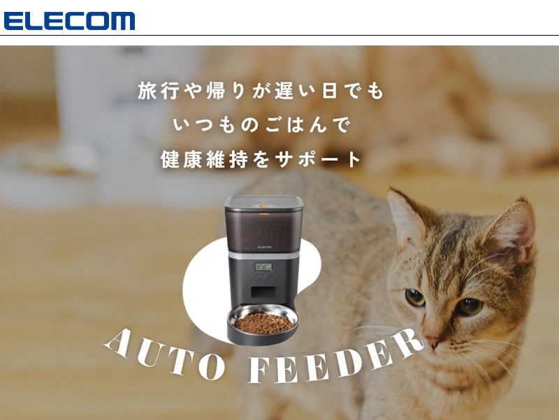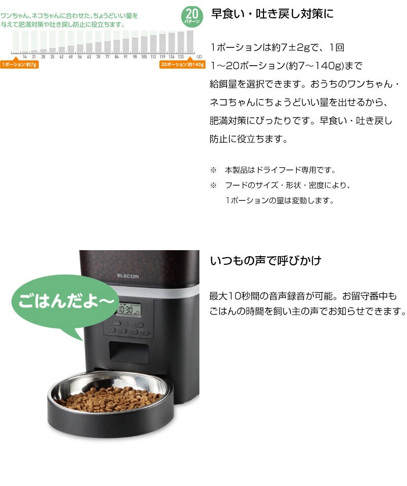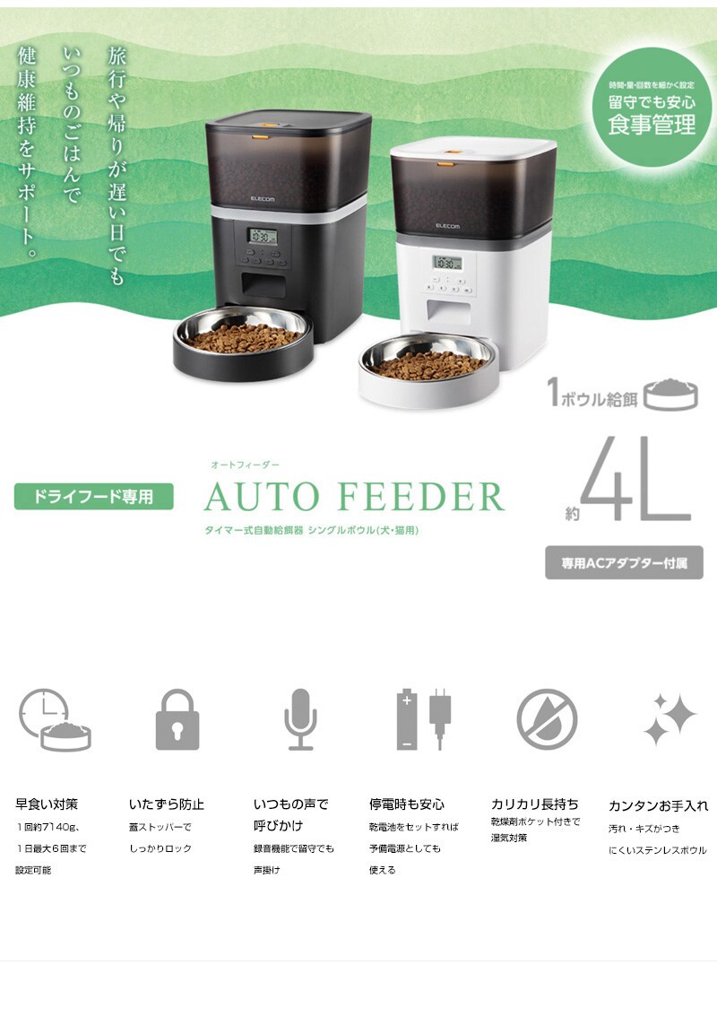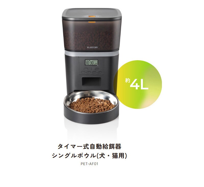 ELECOM ペット用 自動給餌器 (1匹用) ブラック PET-AF01BK 【一皿タイプ ドライフード対応 約4L ネコ 猫 いぬ 犬 ペット 用 録音 ロック タイマー 機能付き 早食い 肥満対策 吐き戻し防止 餌やり 自動 オート 旅行】【おしゃれ おすすめ】