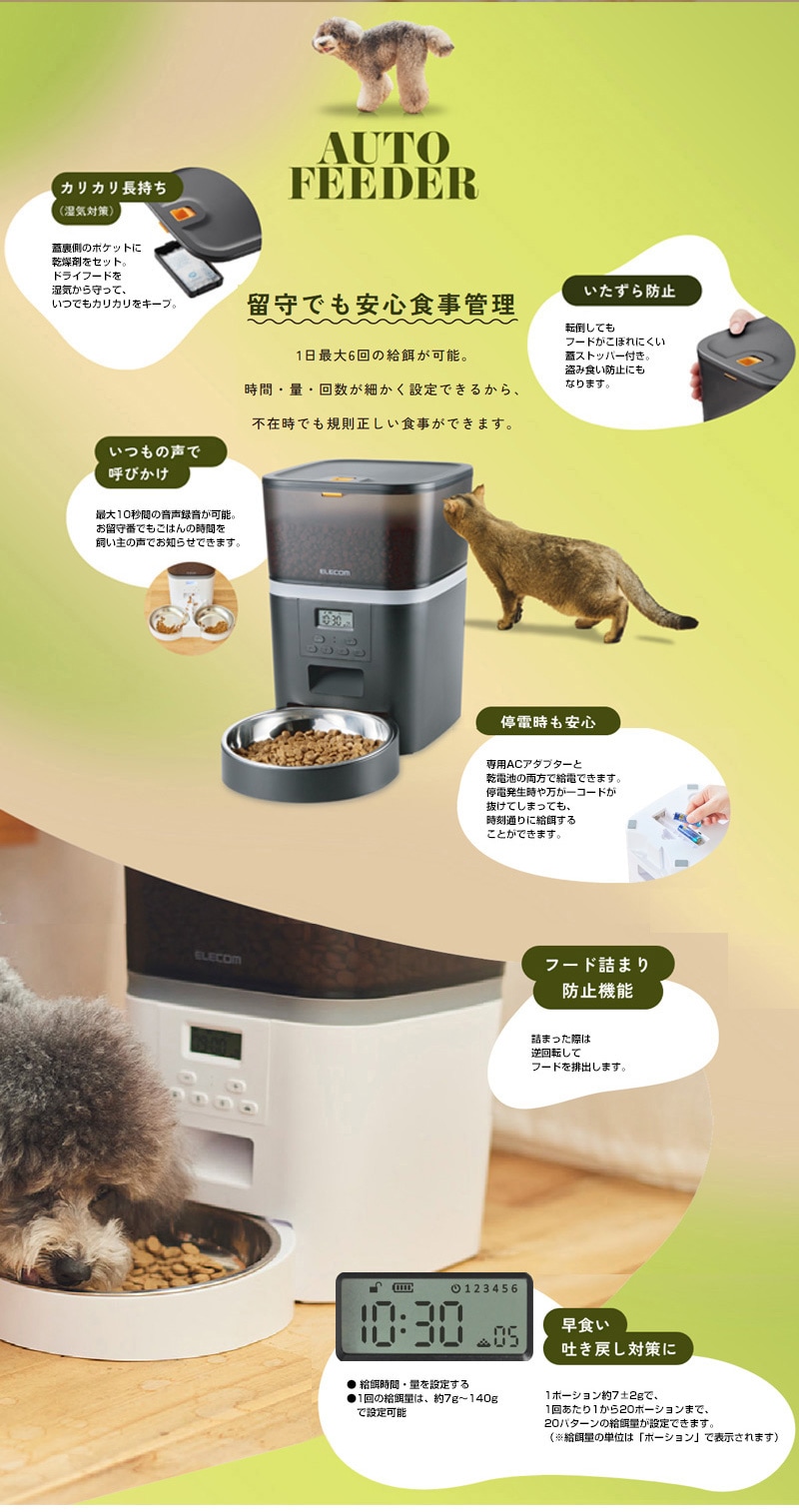 【一皿タイプ ドライフード対応 約4L ネコ 猫 いぬ 犬 ペット 用 録音 ロック タイマー 機能付き 早食い 肥満対策 吐き戻し防止 餌やり 自動 オート 旅行 不在 留守 留守番 エレコム mofult モフルト】