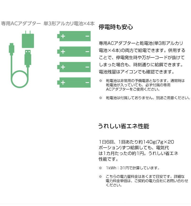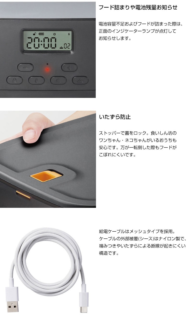 セット内容 専用ACアダプター(入力/AC100V~240V、出力/5V/1A)、専用USB給電ケーブル(約1.46m(コネクター部含まず))、乾燥剤、フードボウル×1