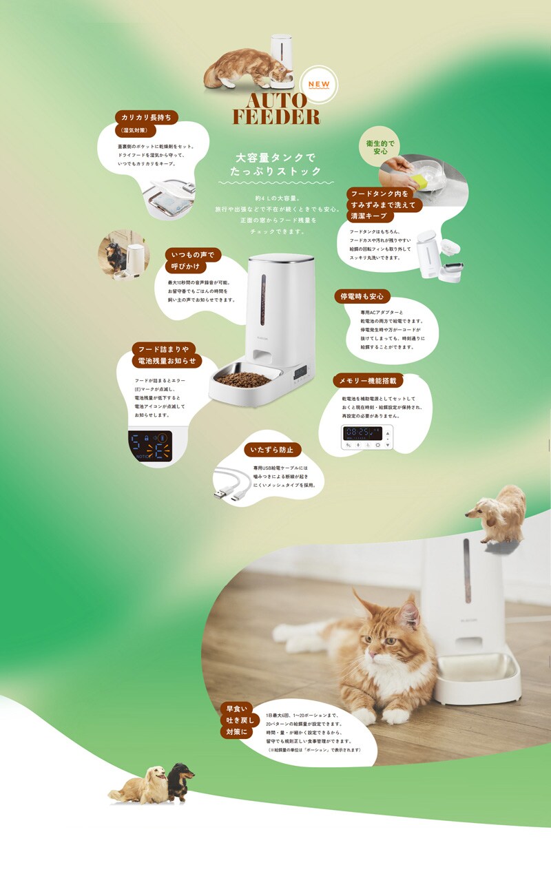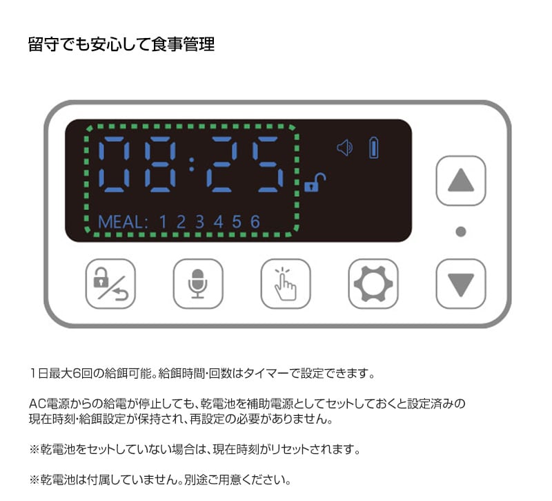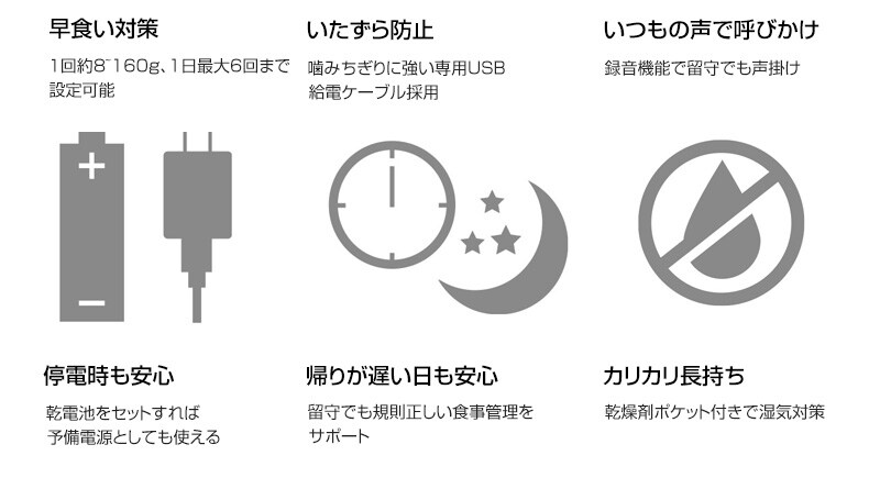 給餌のタイミングや量を細かく設定でき、規則正しい食生活でワンちゃん・ネコちゃんの健康維持をサポートするタイマー式自動給餌器です。