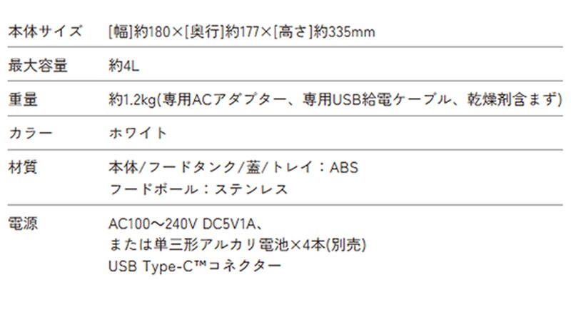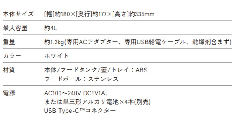 重量 約1.2kg(本体のみ。フードボウル、専用ACアダプター、専用USB給電ケーブル、乾燥剤含まず)