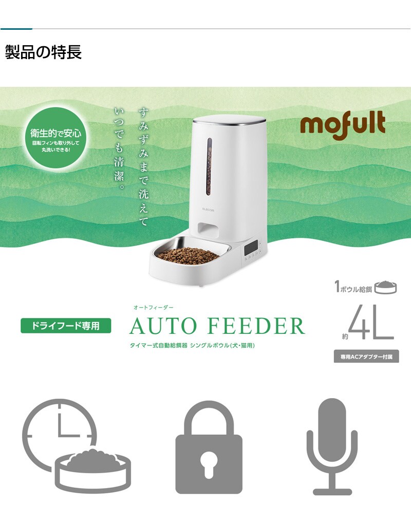 【1匹用 ドライフード対応 約4L ネコ 猫 いぬ 犬 ペット 用 録音 ロック タイマー 機能付き 早食い 肥満対策 吐き戻し防止 餌やり 自動 オート 旅行 不在 留守 留守番 エレコム mofult モフルト】