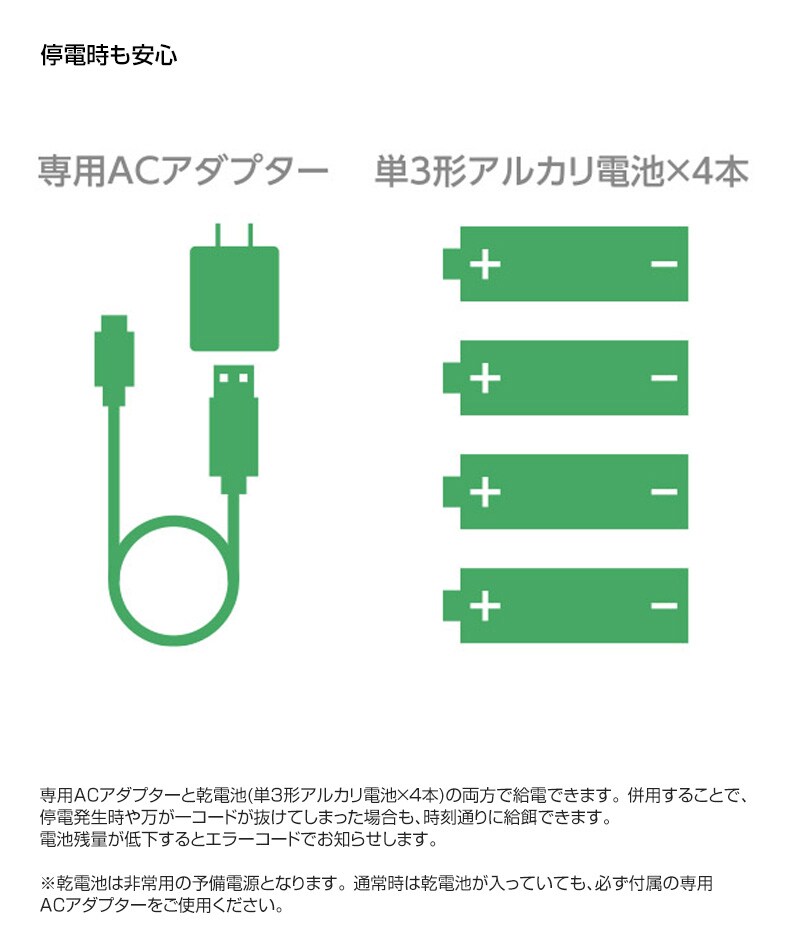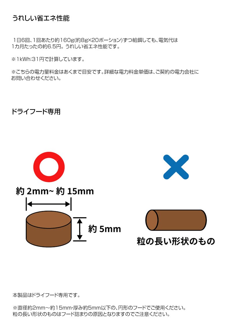※3直径約2~15mm、厚み約5mm以下のフードでご使用ください。粒の長い形状のものはフード詰まりの原因となりますのでご注意ください。
