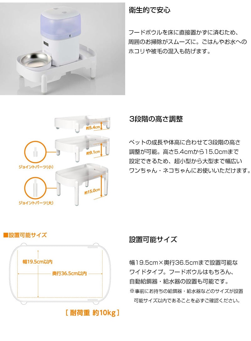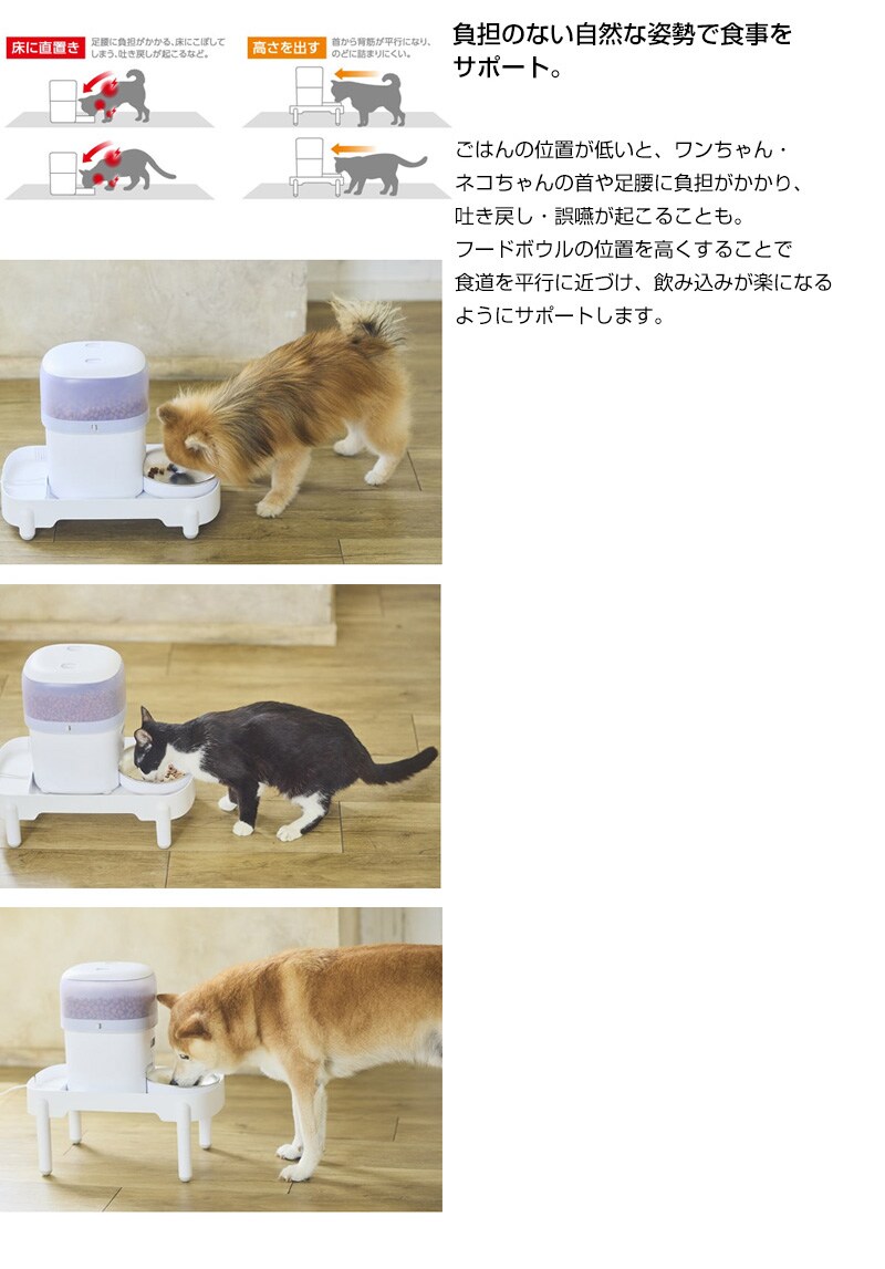 自動給餌器・給水器やフードボウルの高さを調整し、首や足腰に負担をかけずにお使いいただけます。