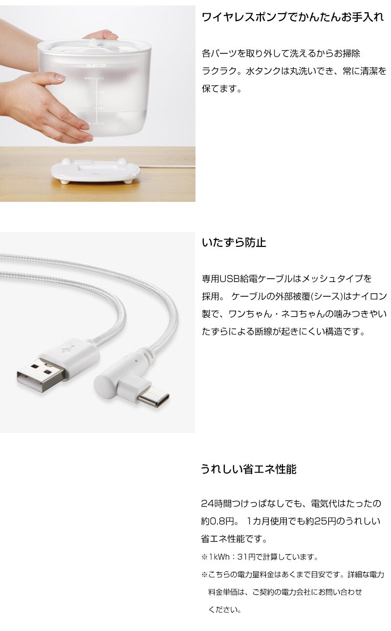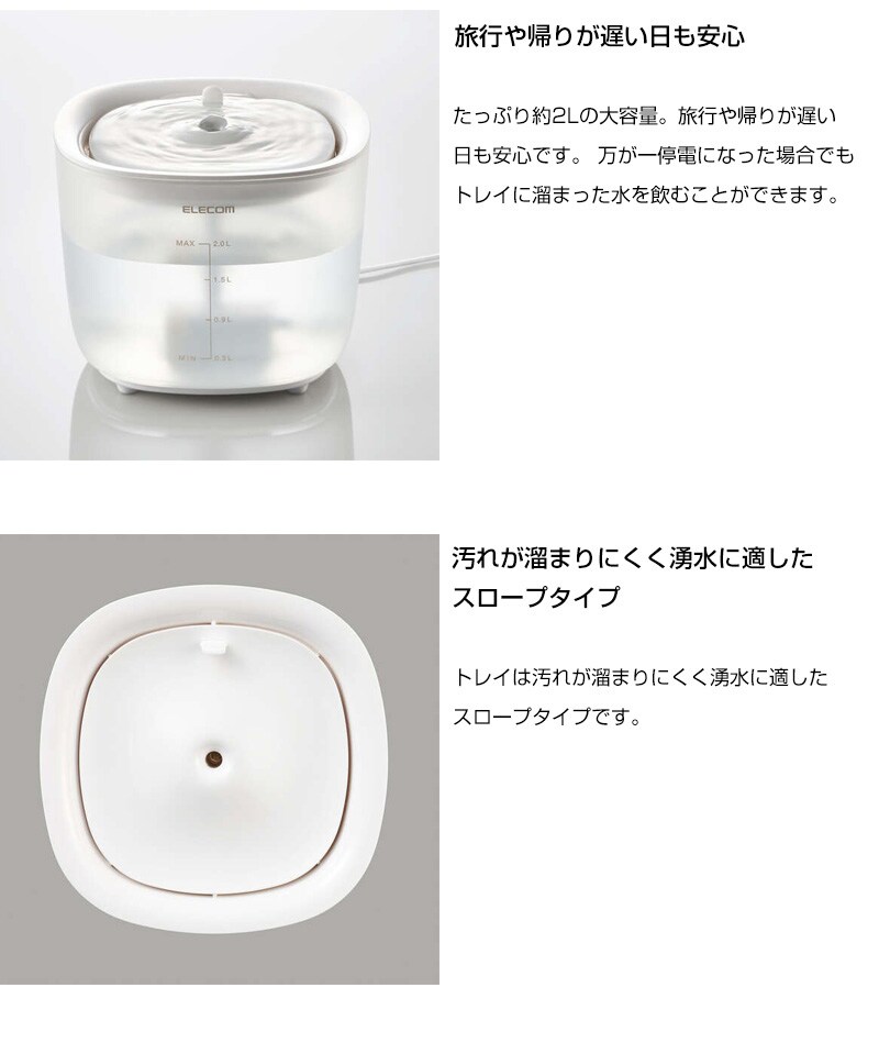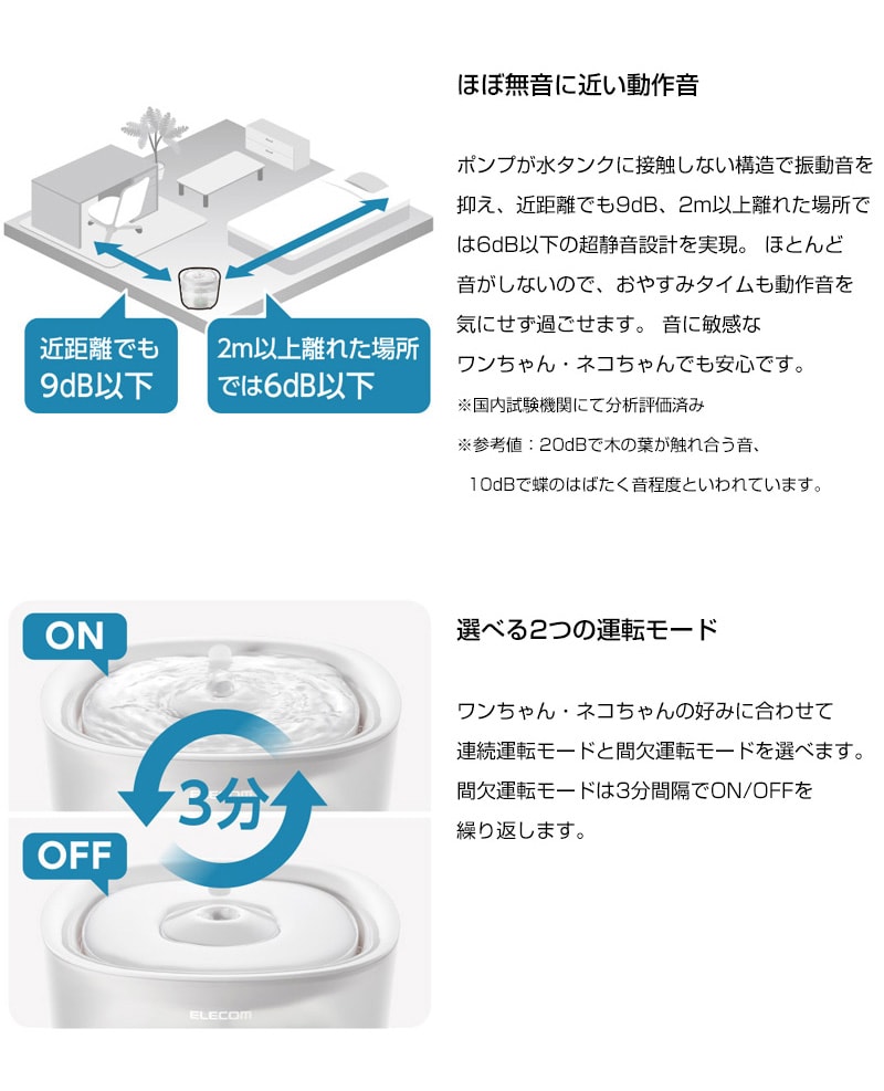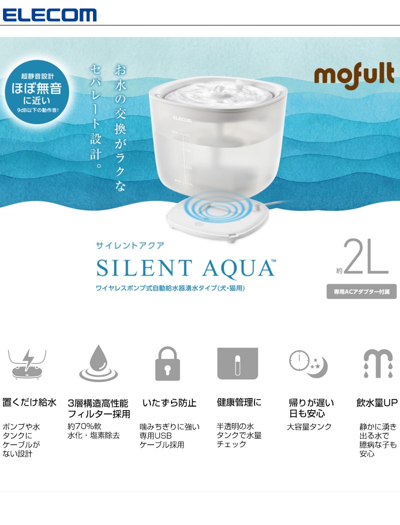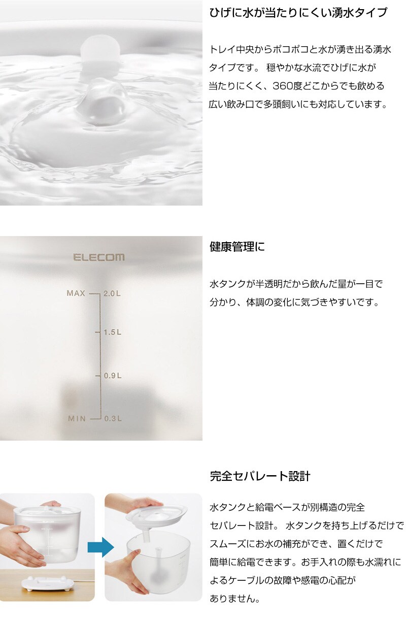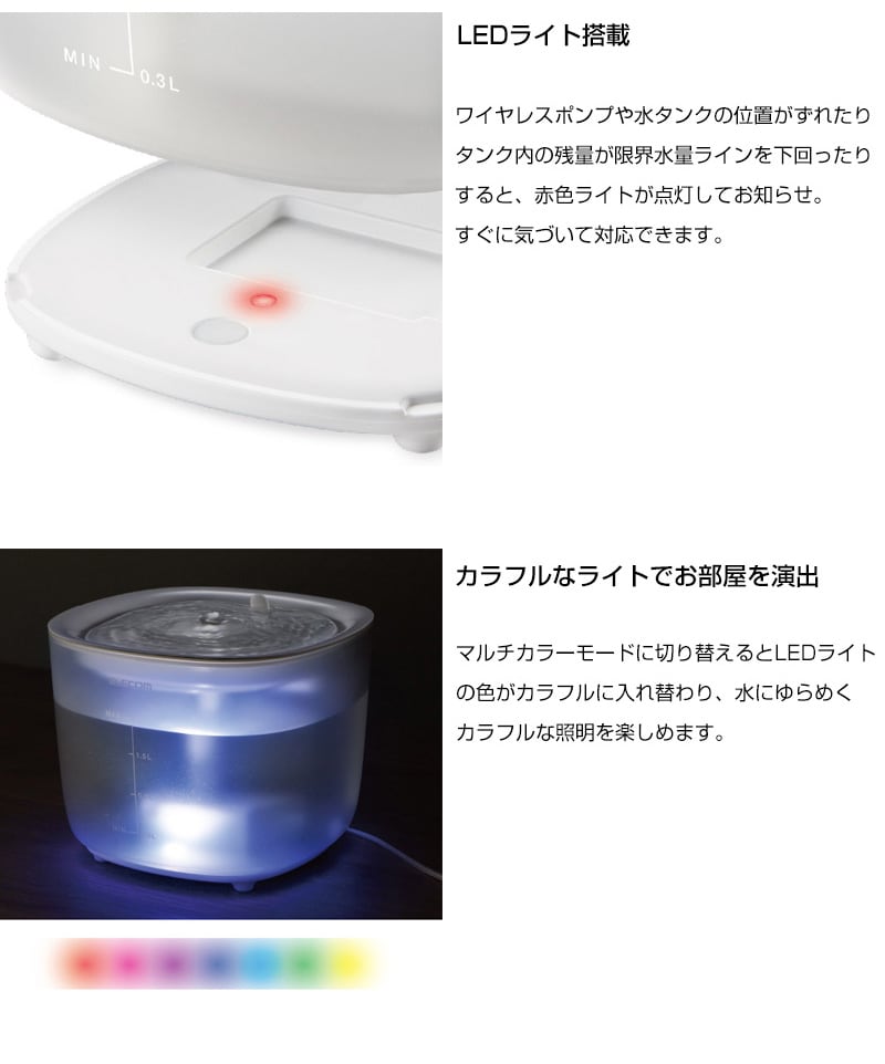 ELECOM ペット用 自動給水器 2L ワイヤレスポンプ式 サイレントアクア PET-WD02WH 【水飲み器 給水機 湧水タイプ 丸洗い 省エネ 高密度三層 軟水化フィルター キレイをキープ LEDライト ネコ 猫 いぬ 犬 ペット 用】【おしゃれ おすすめ】