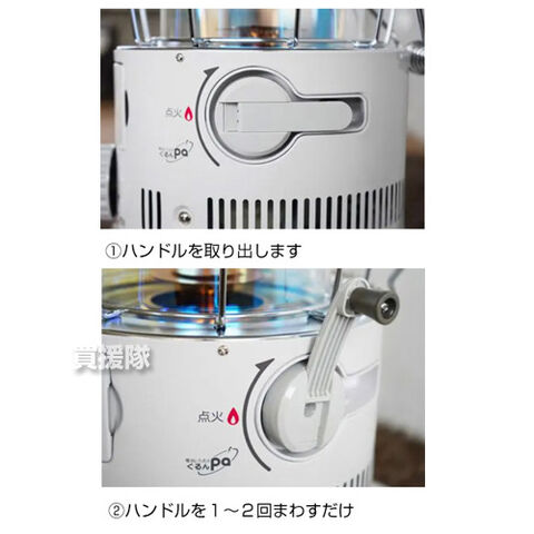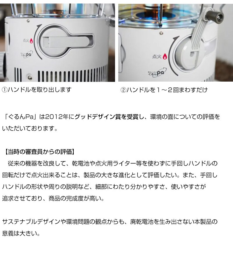 手回しハンドルをぐるっと回してパッと点火できる機能です。