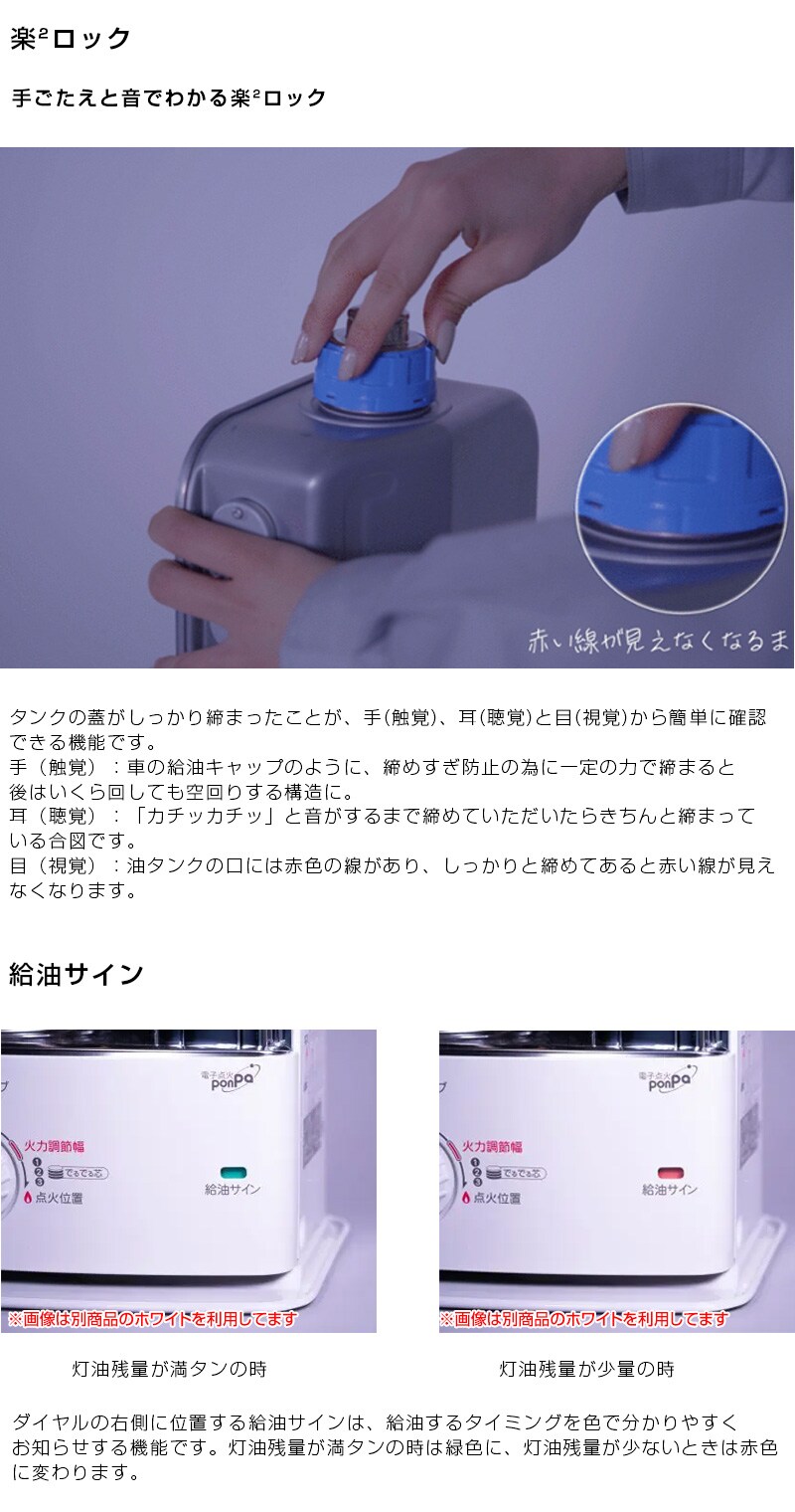 燃焼継続時間 約12.9h 最大燃焼~約15.2h 最小燃焼