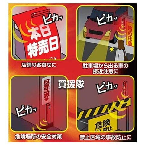 電池寿命 1日10回(20秒間/1回)動作時、光だけでは約6ヶ月、光とアラーム音(最大)では約3ヶ月 (動作回数により変動する)