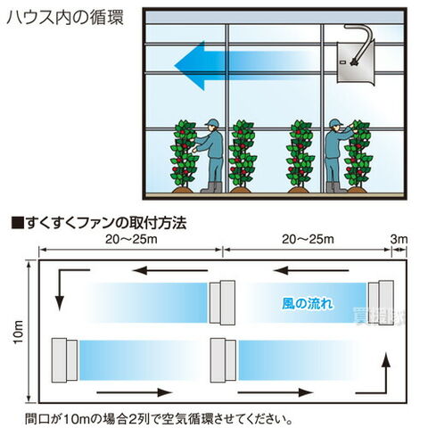 空気を循環させることにより温室内の温度ムラを解消し、夏場の局所的な高温状態を改善する効果があります。
