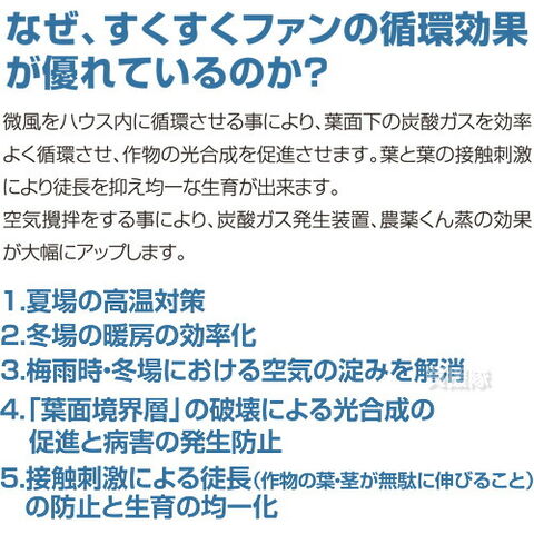 微風をハウス内に循環させる事により、葉面下の炭酸ガスを効率よく循環させ、作物の光合成を促進させます。葉と葉の接触刺激により徒長を抑え均一な生育が出来ます。空気攪拌をする事により、硫黄くんえん、炭酸ガス発生装置、農薬くん蒸の効果が大幅にアップします。