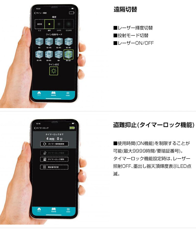 【盗難抑止(タイマーロック機能)】■使用時間(ON機能)を制限することが可能(最大9999時間/要暗証番号)。タイマーロック機能設定時は、レーザー照射OFF、墨出し器天頂輝度表示LED点滅。