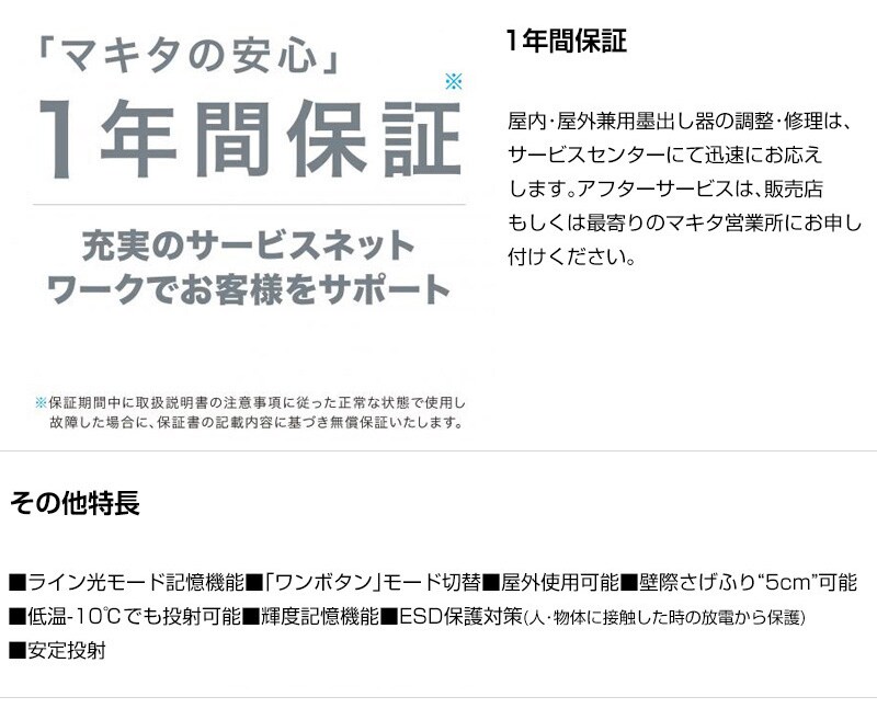 【1年間保証】屋内・屋外兼用墨出し器の調整・修理は、サービスセンターにて迅速にお応えします。アフターサービスは、販売店もしくは最寄りのマキタ営業所にお申し付けください。