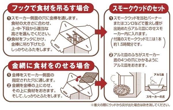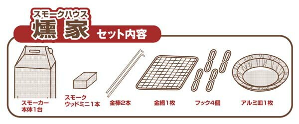 セット内容 本体、スモークウッドミニ(さくら1本)、アルミ皿(1枚)、金棒(2本)、金網(1枚)、吊り下げフック(4本)