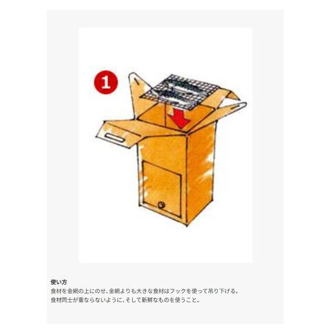 (1)食材を金網の上にのせます。金網よりも大きな食材は、フックを使って吊り下げます。どちらの場合も食材同士が重ならないようにしましょう。なるべく新鮮な食材を使うのもポイントです。