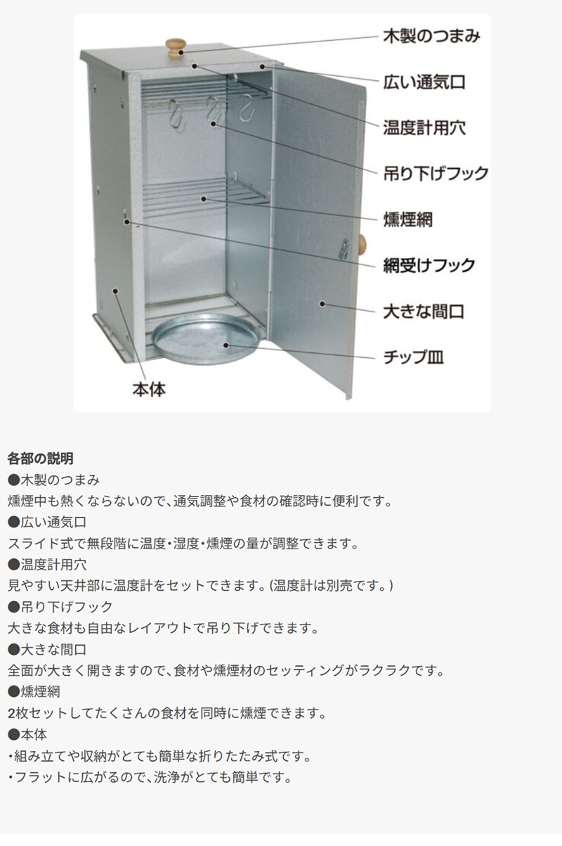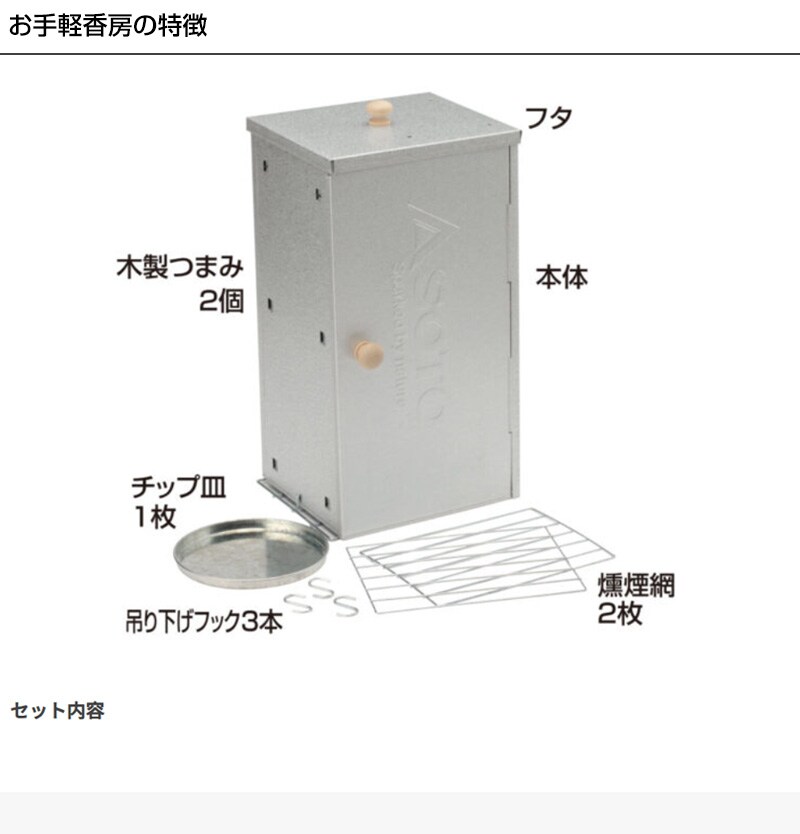 セット内容 本体、フタ、燻煙網(2枚)、チップ皿(1枚)、吊り下げフック(3本)、木製つまみ(2個)