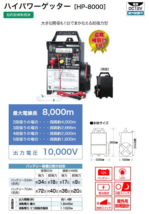 【末松電子 SUEMATSU KSDS ハイパワーゲッター 【超強力型】 HP-8000 No.105 防獣 害獣 害獣 動物 対策 農業 農作業 菜園 農家 電気柵】