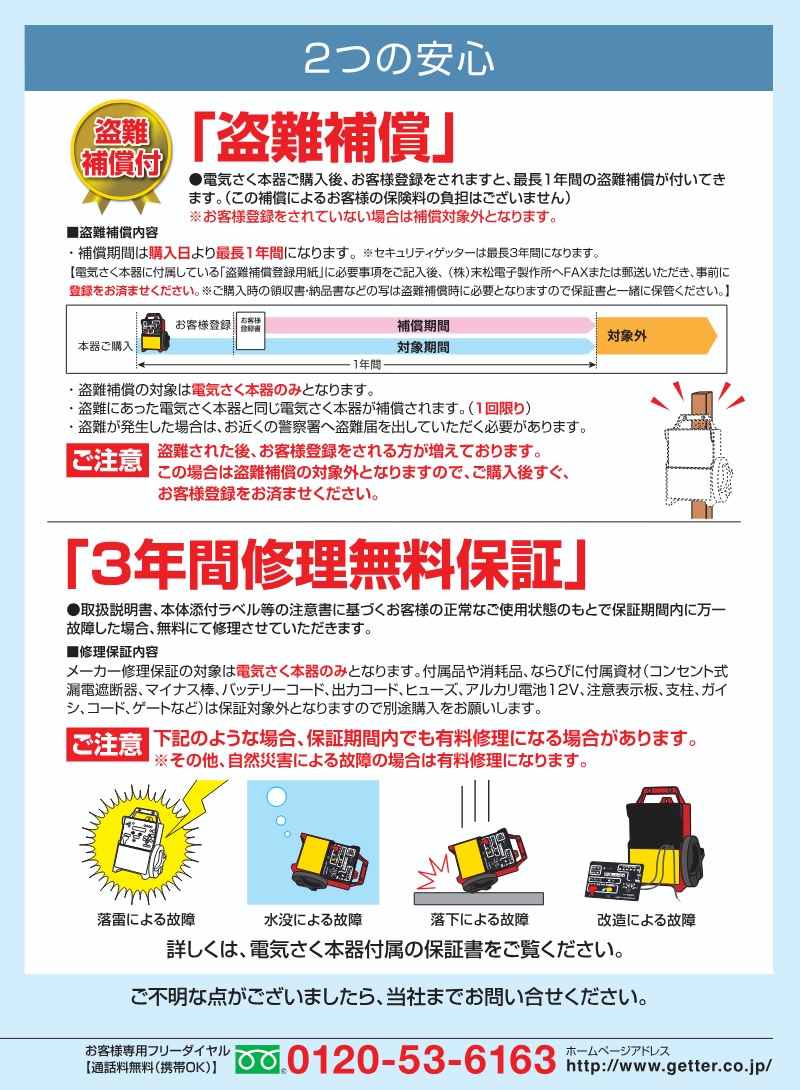 付属品 ゲッターアルカリ電池12V、バッテリーコード、取扱説明書、アース棒30型、注意表示板(2枚)、保証書/登緑カード