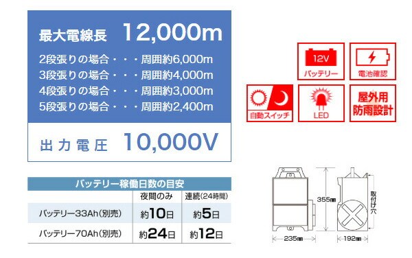 ・バッテリー33Ah(別売) [夜間のみ:約10]、[連続(24時間):約5]