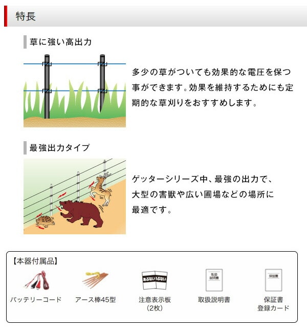 付属品 バッテリーコード、アース棒45型、取扱説明書、注意表示板(2枚)、保証書/登緑カード