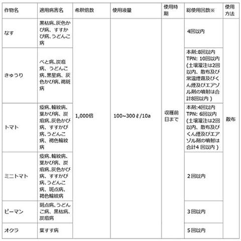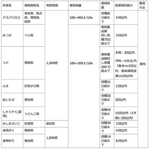 ※花き類に使用する場合、薬液による汚れが生じるおそれがありますので、収穫間際の散布は避けてください。しそに使用する場合、薬液による汚れが生じるおそれがありますので、葉にかからないように株元に散布してください。レタスに使用する場合、生育遅延のおそれがありますので高温期の灌注はさけてください。芝に使用する場合、夏期高温時の散布、特に暖地では葉に薬害(黄変または褐変)を生じることがありますので注意してください。
