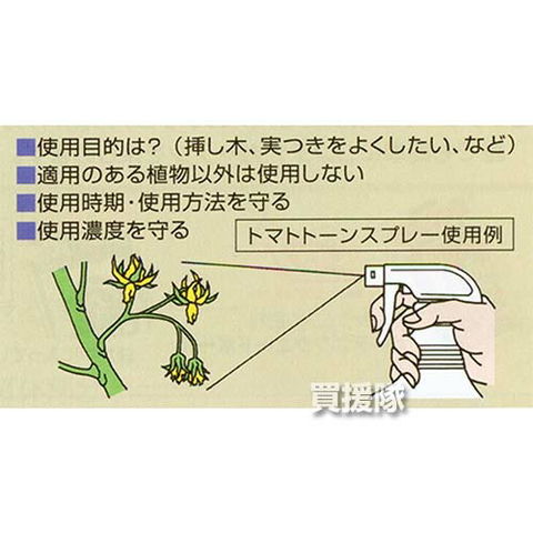 用途 トマトやなすの花に散布することで、実の着きを良くする植物成長調整剤。
