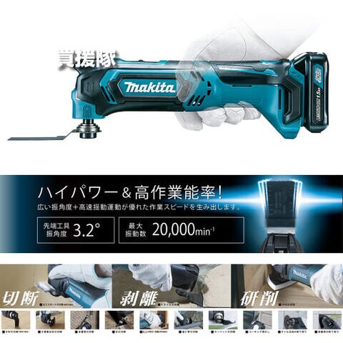 付属品 バッテリBL1015、充電器DC10SA、ケース、カットソーTMA047(A-63797)、サンディングパッド(A-59405)、サンディングペーパー(木工用#60/#120/#240各2枚)、六角棒スパナ、ツールボックス