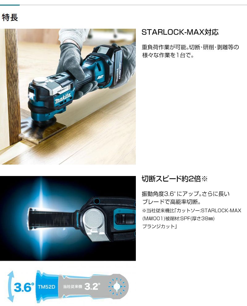 マキタ 充電式マルチツール [本体のみ/バッテリ・充電器・ケース別売] TM52DZ 【makita 正規品 18V STARLOCKMAX PLUS 対応 切断 剥離 研削 研ぐ 削る 木材 金属 鉄筋 塩ビ管 弾性シーリング 除去 モルタル セメント ス】【おしゃれ おすすめ】