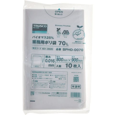 品名 TRUSCO バイオマス25%ポリ袋0.016x800x900mm 10枚入(70L用・透明)