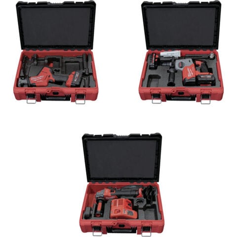 ・M18 FUEL 工具3種類、バッテリー3個、充電器1個、PACKOUTツールボックス3個がセットのパワーパックです。